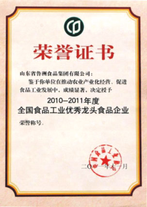 會上,集團被中國食品工業(yè)協(xié)會授予,“2010-2011年度全國食品工業(yè)優(yōu)秀龍頭食品企業(yè)”,并頒發(fā)了榮譽證書和獎牌。